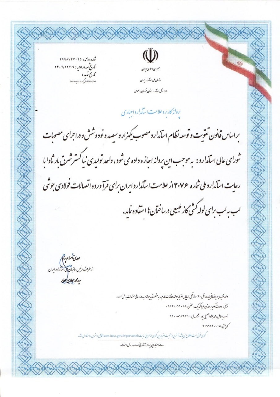 اليوم، وبفضل إنتاج مختلف الوصلات مثل السردندة، والمحوّل، والكوع، والثلاثي بمقاسات متعددة، أصبحت شركة فولاد نیاگستر أول منتج في شرق البلاد يحصل على شهادة المواصفات من الهيئة الوطنية للمواصفات الإيرانية. كما أن تجهيز الورش الإنتاجية والمختبرات المتطورة، إلى جانب الحصول على شهادة المواصفات الوطنية، يُعد دليلاً على الجودة العالية لمنتجاتنا.
